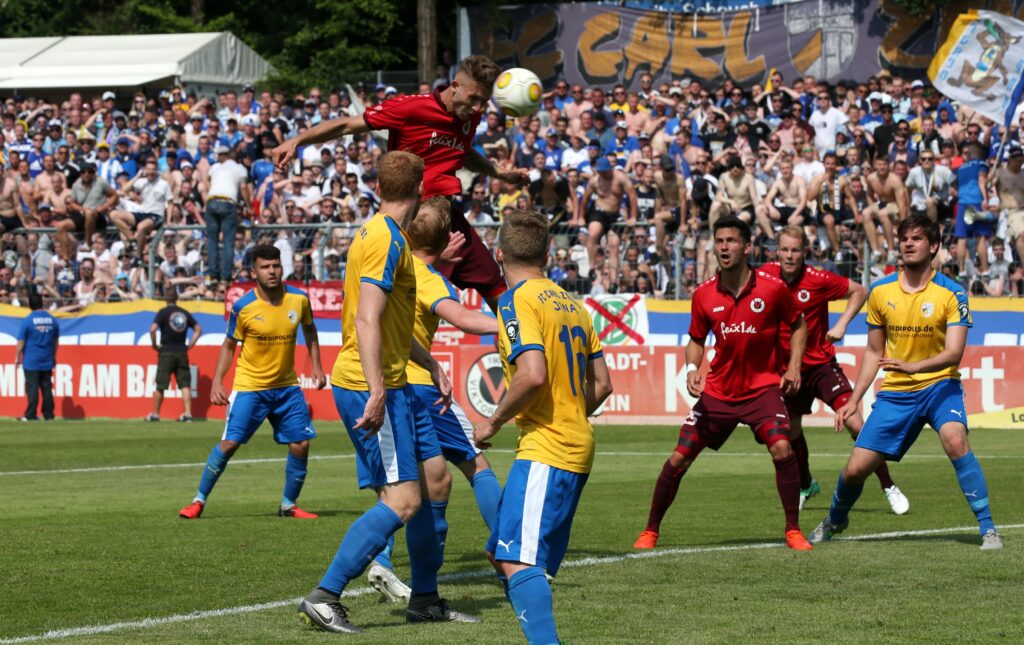 Trotz der nun sehr unglücklichen Ausgangslage ließ sich die Mannschaft von Marco Antwerpen aber nicht hängen und spielten weiter nach vorne. In der 72. Minute war es dann soweit: Mike Wunderlich verwandelte einen fälligen Elfmeter sicher zum 1:3. Das setzte bei den Viktorianern noch einmal neue Kräfte frei, die jetzt mit viel Druck auf den Kasten von Raphael Koczor drängten. Drei Minuten vor Schluss wurden die Bemühungen belohnt, Innenverteidiger Dominik Lanius köpfte nach Flanke von Fatih Candan ein. Anschließend rettete FCC-Keeper Koczor noch einmal stark und bewahrte Jena vor dem Ausgleich. Einen großen Wermutstropfen mussten die Viktoria-Anhänger dann doch noch einstecken: Mike Wunderlich flog in der Schlussminute wegen Beleidigung eines FCC-Spielers vom Platz und wird damit im Rückspiel fehlen. Aber auch bei Jena droht ein wichtiger Akteur auszufallen. Doppeltorschütze Timmy Thiele sackte bei einem Pressschlag zusammen und zog sich vermutlich einen Mittelfußbruch zu – eine Untersuchung im Krankenhaus steht noch aus.