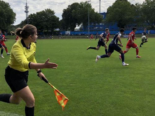 Spielverlauf: Nach der 0:3-Auftaktniederlage gegen Fortuna Düsseldorf hatten sich die U 19-Spieler der Viktoria einiges vorgenommen. Die Höhenberger griffen früh an und erspielten sich erste Torchancen durch Joel Vieting (2.) und Ilhan Altuntas (4.). Letzterer kam von der Strafraumkante zum Abschluss, sein Ball ging allerdings über das Tor. In der Folge blieb die Viktoria bissig und konnte vom VfL häufiger nur durch Fouls gestoppt werden. In der 28. Spielminute kam es nach einem unfairen Einsteigen kurz vor dem Bochumer Strafraum zu einem Freistoß. Seokju Hongs Ball streifte allerdings nur das Außennetz, nachdem er abgefälscht worden war. Doch auch der VfL wusste Gefahr im gegnerischen Strafraum zu erzeugen: In der 34. Minute geriet ein Bochumer im Laufduell innerhalb des Sechzehners zu Fall, Schiedsrichterin Kathrin Heimann entschied auf Foulelfmeter. Viktoria-Torhüter Mika Rudnick erahnte die rechte Ecke, doch der Schuss von VfL-Mittelfeldspieler Leon Tasov war zu platziert. Mit einem 0:1-Rückstand ging es in die Pause.
