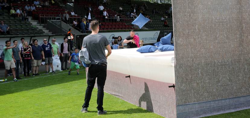 Betten-Sauer präsentierte sich als „Sponsor of the Day“ und nutzte diesen Status, um ein unterhaltsames sowie außergewöhnliches Halbzeitspiel auf die Bettpfosten zu stellen. Beim Kissenwerfen auf ein übergroßes Bett sollte die auf der Bettmitte angebrachte Zielscheibe getroffen werden, um möglichst viel Geld für die Viktoria-Jugend zu erspielen. In zwei Durchgängen mit je zehn Teilnehmern versuchten Jung und Alt mit gezielten Würfen ins Schwarze zu treffen. Für ein Kissen in der Mitte der Scheibe gab es 50€, ein Treffer auf den äußeren Rand brachte 20€, ein Wurf auf das Bett immerhin noch 10€. Nachdem alle Teilnehmer geworfen hatten, verdoppelte Geschäftsführer Michael Gouram die erworfenen 250€ großzügig noch einmal um 250€ auf insgesamt 500€.