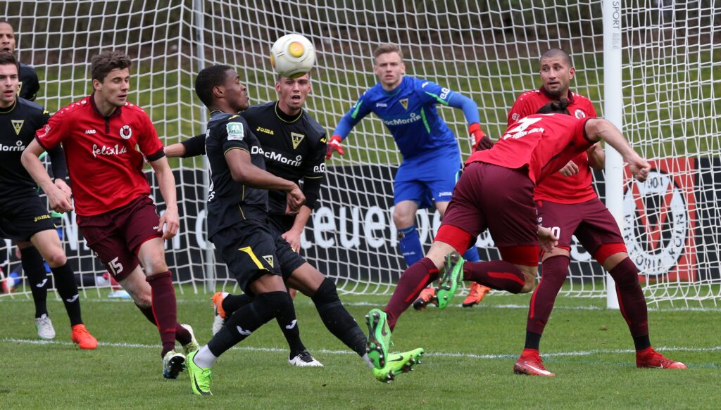 Die erste Gelegenheit hatte allerdings die Alemannia, aber Philipp Kühn parierte gegen den Schuss von Jay Mickels stark. Die klasse Tat schien die Viktoria nun zu beflügeln, denn sie entwickelte im Anschluss durchaus ein optisches Übergewicht. Die damit einhergehenden Chancen konnten sich sehen lassen, brachten aber keinen Erfolg. Timm Golley zwang den Aachener Keeper mit einem Flachschuss zu einem starken Reflex, bei der anschließenden Ecke drosch Felix Backszat den Ball über das Gehäuse. Kurz darauf verpasste Fatih Candan die Führung, als er dem herausstürmenden Mark Depta nach einem langen Ball an den Fuß schoss (24.). Auch der Schiedsrichter war zunächst nicht auf der Seite der Viktoria, denn nach einem Schubser gegen Patrick Koronkiewicz an der Strafraumgrenze blieb die Pfeife stumm (37.). Auch ein Seitfallzieher von Felix Backszat (39.) flog über das Netz.