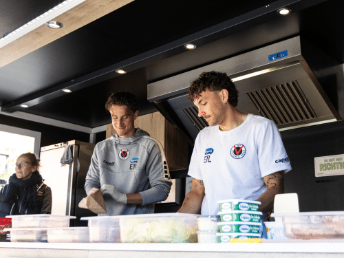 Mitte Mai standen die beiden Profis Engelhardt und Sticker gemeinsam mit dem „Frühstück für Pänz“-Team im Truck. Ab morgens haben sie im Rahmen unserer Gemeinwohlklausel unterstützt – und das bedeutet: Laugengebäck belegen, Obst, Gemüse und Smoothies vorbereiten. Zu Beginn der ersten Schulstunde haben sie alles an die Schülerinnen und Schüler verteilt. Und bis zur ersten Pause ging es weiter damit, Brote zu belegen.