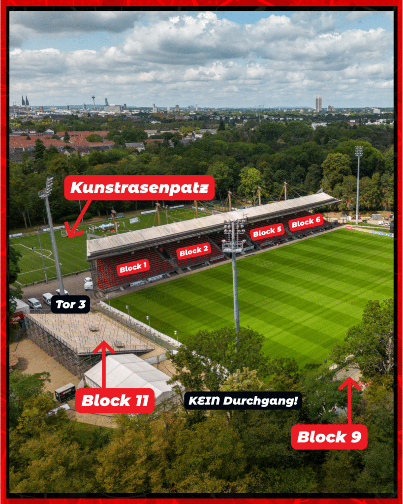 Dann ist diese Info wichtig für Dich: Möchtest du an den Aktionen am Kunstrasenplatz teilnehmen, nutze bitte zunächst den Haupteingang um zu den Aktionen zu gelangen. VOR ANPFIFF nutzt Du dann bitte wieder den Haupteingang, um das Stadion zu verlassen. Du gehst links an Block 11 vorbei und dann nochmal links in die Merheimer Heide. Dort befindet sich der Eingang zu Tor 9. WICHTIG: Ist dein Ticket einmal an Block 9 gescannt, kommst du damit nicht erneut in den Block. Möchtest du also zum Kunstrasen, gehe vorher NICHT zu Block 9!