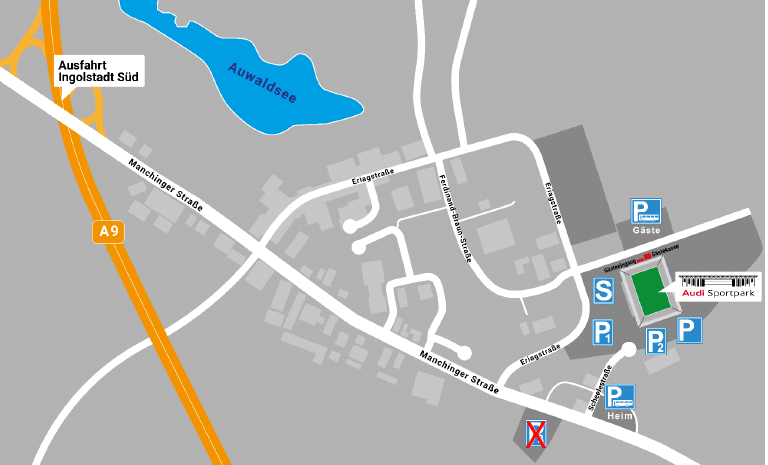 Fahren Sie bei der Ausfahrt „Ingolstadt-Süd“ von der A9 ab, biegen Sie links ein auf die Manchinger Straße Richtung Ingolstadt-Süd/Gewerbegebiet und folgen Sie dem Straßenverlauf circa 2 km. Die Parkplätze sind ausgeschildert. Wir empfehlen für Gästefans den Parkplatz P1.