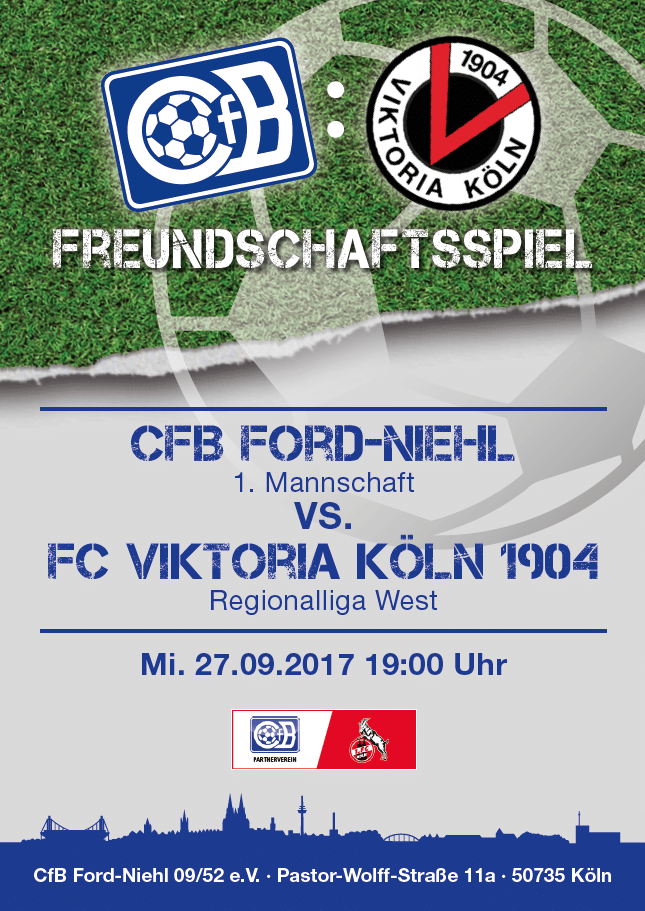 Unsere Viktoria bestreitet heute ein Freundschaftsspiel gegen den CFB Ford-Niehl aus der Kreisliga B! Um 19:00 Uhr wird auf der Anlage an der Pastor-Wolff-Str. 11 a angepfiffen, die Gastgeber werden alles dafür tun, dass sich auch Viktoria-Fans wohl fühlen! Wir freuen uns über alle Unterstützer!