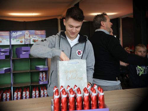 „Wir machen das Ganze schon zum neunten Mal“, so Kölsche-Fründe-Vorstand Jörg Topfstedt. Insgesamt 2.000 Päckchen wurden im neuen ViP-Zelt von Viktoria Köln gepackt. Mitgeholfen haben neben Mitarbeiter:innen der Viktoria-Geschäftsstelle auch die beiden Profis Florian Engelhardt und Benni Hemcke. Und das mit vollem Herzblut: „Das ist eine sehr tolle Aktion“, zeigte sich Hemcke nach getaner Arbeit begeistert. „Wir hatten viele Helfer, um vielen Kindern eine Freude zu machen. Wir wissen, dass es auch in unserer Region viele arme Kinder gibt. Ich habe gerne meinen freien Sonntag geopfert, um vielen Kindern eine Freude zu machen!“