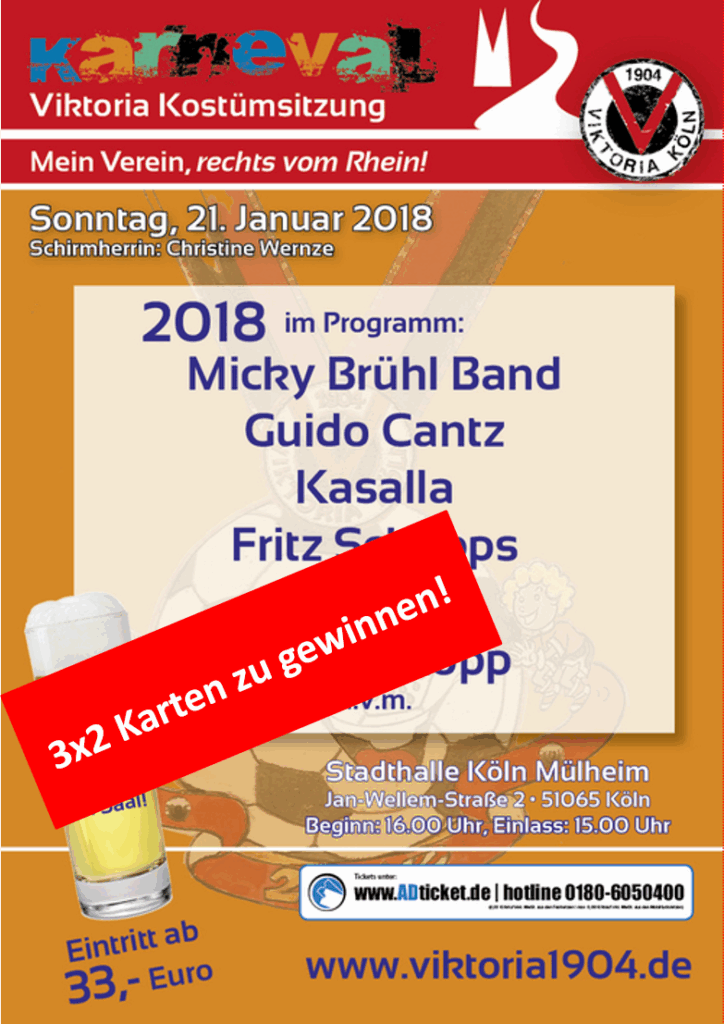 Auf unserer Facebook-Seite könnt Ihr jetzt 3×2-Karten für die Viktoria-Karnevalssitzung am 21.01.2018 in der Stadthalle Köln-Mülheim gewinnen. Dazu müsst Ihr nur unter den entsprechenden Beitrag liken und kommentieren, warum genau Ihr die Karten gewinnen möchtet: http://bit.ly/2d3z03o