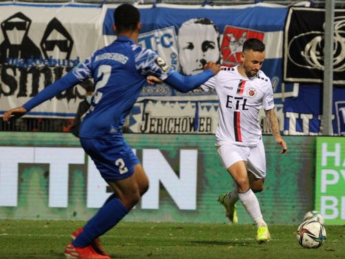Und es geht gleich mit einem Aufreger los. Gerade einmal 128 Sekunden sind gespielt, da unterläuft Magdeburgs Tobias Müller ein fürchterlicher Querschläger, Simon Handle startet durch, läuft allein aufs Tor zu, hat die Blitzführung auf dem Fuß. Aber Müller zieht am Trikot, Handle fällt. Schiedsrichter Lukas Benen zögert keine Sekunde. Klare Sache: Platzverweis. Der Kapitän der Gäste muss in die Kabine. Den Freistoß aus 18 Metern zirkelt Marcel Risse knapp über das Magdeburger Tor.
