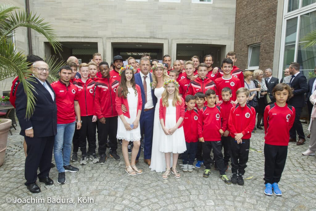 Am Samstag hat unser Sport-Vorstand Franz Wunderlich seiner Sandra auf dem Standesamt in Köln das Ja-Wort gegeben. Anschließend gab es für das frischgebackene Brautpaar, das sich vor fünf Jahren kennenlernte, im nahegelegenen Consilium einen Empfang. Neben Freunden und Familie gehörten auch zahlreiche Spieler der 1. Mannschaft zu den anwesenden Gästen.
