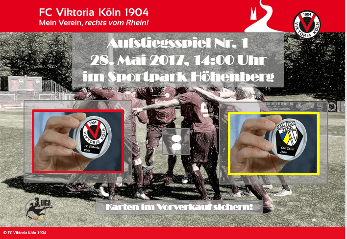 die Vorfreude auf die beiden Relegationsspiele gegen den FC Carl Zeiss Jena steigt von Tag zu Tag. Das Hinspiel findet bei uns am 28.05.2017 (14:00 Uhr) im Sportpark Höhenberg statt – hier präsentieren wir euch die ersten Informationen zum Vorverkauf: