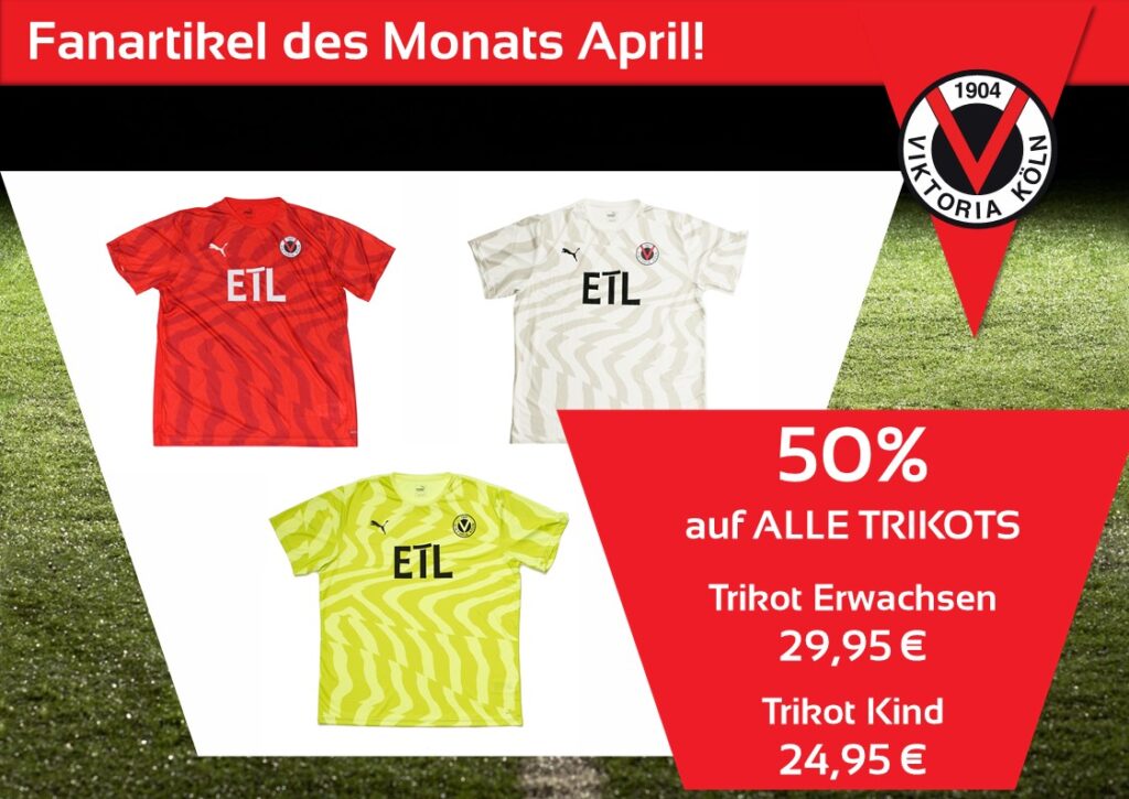 Neuer Monat, neue „Fanartikel des Monats“ – und die haben es in sich! Denn im April sind alle Trikots von Viktoria Köln – egal ob mit oder ohne Beflockung – 50 Prozent günstiger. Unbeflockte Trikots für Erwachsene kosten im Moment 29,95 Euro, die für Kinder 24,95 Euro. Sie sind in verschiedenen Größen und Farben (weiß, rot oder gelb) erhältlich. Das Angebot gilt allerdings nur, solange der Vorrat reicht. Deshalb lohnt es sich, schnell zu sein. Bis Ostermontag kommen die Viktoria-Fanartikel sogar versandkostenfrei!