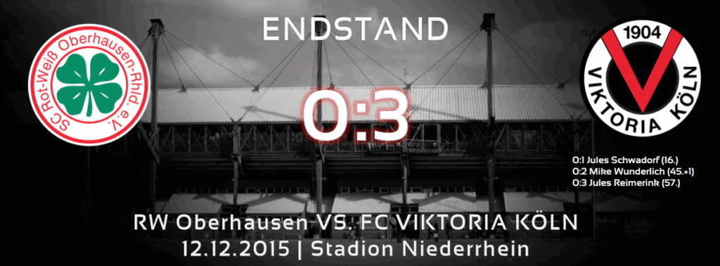 Im letzten Spiel des Jahres gewinnt Viktoria Köln mit 3:0 (2:0) gegen RW Oberhausen. Schwadorf (16.), Wunderlich (45.+1) und Reimerink (57.) erzielen die Tore für unsere Viktoria.