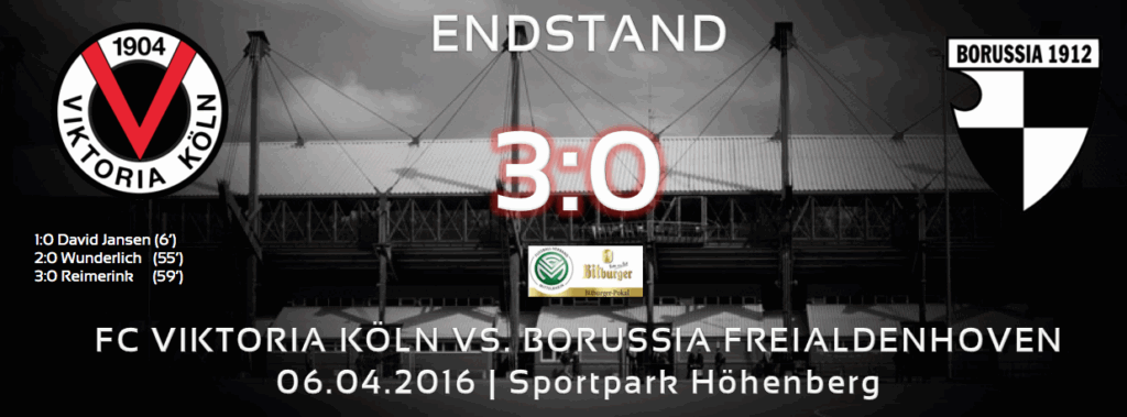 Viktoria Köln löst, durch einen vor allem in der 2. Halbzeit überzeugenden Auftritt, das Ticket für das Finale im Bitburger Pokal. Die Tore gegen den Mittelrheinligisten Borussia Freialdenhoven erzielten Jansen (6’), Wunderlich (55’) und Reimerink (59’) für unsere Viktoria.