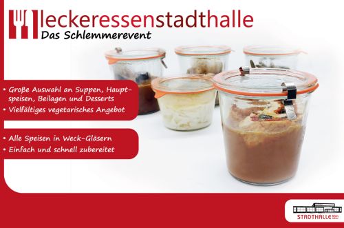 Was bedeutet das? In der Küche der Stadthalle werden die Speisen professionell und in Restaurantqualität vorbereitet. Im heimischen Ofen oder der Pfanne können sie dann fertiggestellt werden. Die Gerichte werden in Weck-Gläsern abgefüllt, dort bleiben sie tagelang haltbar. Sie können dann direkt in den Weck-Gläsern erhitzt werden. So fällt kein lästiger Verpackungsmüll an.