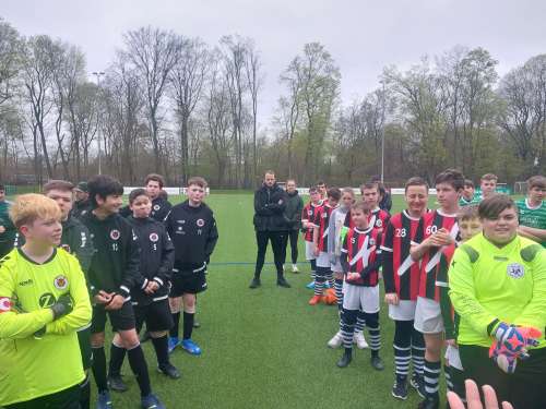 Bevor es dann mit dem Turnier der Ü17 weiterging, ließen es sich die Inklusionsteams der Viktoria nicht nehmen, Geschäftsführer Norbert Bruhn sowie Lisa Schiepan und Lea Schmitz (beide Gemeinwohl & CSR) eine kleine Aufmerksamkeit zu überreichen, um für die Integration in den Verein zu danken. „Wir sind einfach alle unfassbar stolz, Teil dieses Vereins zu sein und wollten dies einmal zum Ausdruck bringen“, erklärt Denis Kirchdörfer, Leiter des achtköpfigen Trainer- und Betreuerteams.