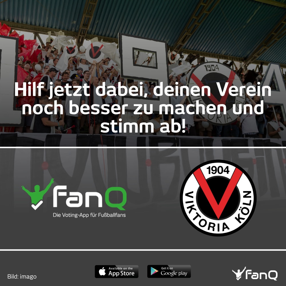 Alles, was ihr tun müsst, ist euch die kostenlose FanQ-App herunterzuladen (im Android- und Apple-Store verfügbar) und über die Fragen zu Viktoria Köln abstimmen. Das Ganze ist alternativ auch im Web unter www.viktoria.fanmeinungen.de möglich. Natürlich bleibt es anonym.