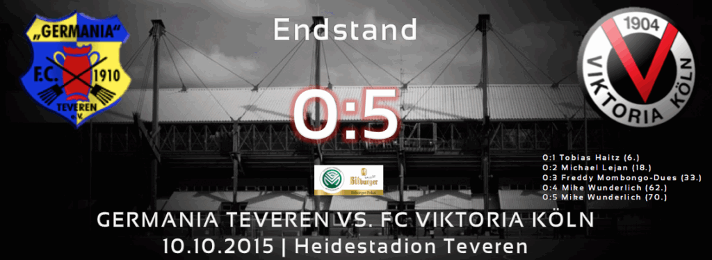 Viktoria Köln erspielt sich in der ersten Runde des Bitburger Pokals einen sicheren 5:0-Sieg gegen den Landesligisten Germania Teveren. Haitz (6.), Lejan (18.), Mombongo-Dues (33.) und Wunderlich (62. / 70.) erzielen die Tore für unsere Höhenberger.