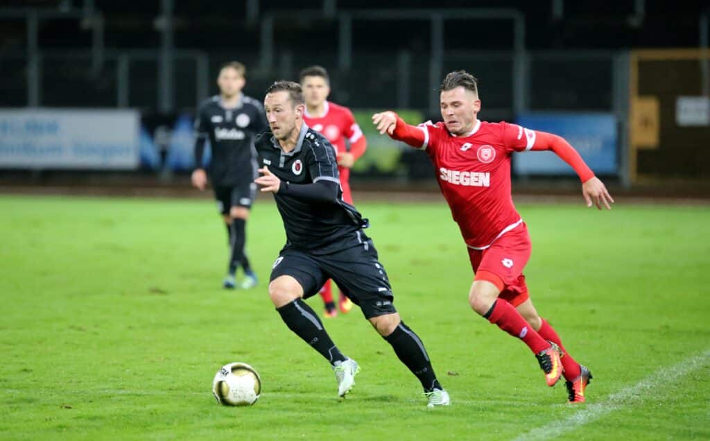 Durch die gegen U21 des 1. FC Kölns erlittene Pleite sah sich Trainer Marco Antwerpen gezwungen, einige Änderungen in der Startformation vorzunehmen. Die wiedergenesenen Daniel Reiche und Edwin Schwarz ersetzen Markus Brzenska und Michael Lejan. Dazu durfte der junge Hamza Saghiri (für Florian Heister in der Partie) auf der Doppelsechs neben Schwarz vorspielen. Die Änderungen schienen sich auszuzahlen, denn die Viktoria zeigte sich im Leimbachstadion gleich von Beginn an überlegen und ließ der Heimmannschaft aus Siegen ab der ersten Minute keine Chance zum Durchatmen. Nach sieben Minuten eröffnete Daniel Reiche mit einem Kopfball den Reigen an guten Torgelegenheiten. Nur kurz darauf hatte Timm Golley gleich eine Doppelchance: zunächst schoss er nach Ablage von Marcel Gottschling ans Außennetz, dann blieb der Siegener Keeper Dominik Poremba Sieger und lenkte den Abschluss des Außenstürmers über die Latte. In Minute 21 war es dann endlich soweit: Sven Kreyer schnappte sich den Ball nach Fehler der Abwehrreihe am Mittelkreis, schüttelte den letzten Verteidiger ab und legte den Ball zur Führung ins Netz. Kurz darauf hätte unsere Mannschaft eigentlich einen Handelfmeter zugesprochen bekommen müssen, nachdem Bauman den Ball regelwidrig mit der Hand gespielt hatte, doch die Pfeife von Schiri Erk blieb stumm. Obwohl die Siegener Elf überhaupt nicht richtig ins Spiel kam, glich sie mit der ersten Chance im ganzen Spiel aus. Arda Nebi schraubte sich nach einer Flanke hoch (34.) und nickte gegen die Laufrichtung Kühns ein. Davon ließen sich unsere Viktorianer aber nicht unterkriegen und kamen durch einen Kopfball von Edwin Schwarz nach einer Ecke zur erneuten Führung (36.). Mit dem 2:1 ging es in die Halbzeitpause.