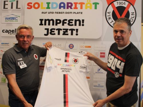 „Unsere Mannschaft wird am Montag ein besonderes Trikot tragen“, warf Andreas Rettig, Vorsitzender der Geschäftsführung bei Viktoria Köln, am Donnerstag bei einer Pressekonferenz einen Blick voraus. „Unser Hauptsponsor ETL verzichtet bei der Pokal-Partie auf seine Trikotpräsenz. Stattdessen wird das Team mit dem Schriftzug ‚Solidarität auf und neben dem Platz – Impfen! Jetzt!‘ auflaufen und somit einen gesellschaftlichen Beitrag leisten, um einer bevorstehenden vierten Corona-Welle entgegenzutreten.“