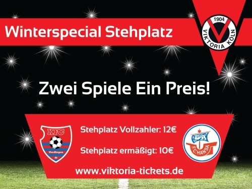 Zwei Spiele, ein Preis! So heißt es beginnend mit dem heutigen Freitag beim Winterspecial von Viktoria Köln: Denn wer vor dem 14. Dezember ein Stehplatzticket für die Heimspiele gegen den KFC Uerdingen (14. Dezember) und den F.C. Hansa Rostock (20. Dezember) kauft, kann für 12 Euro (ermäßigt 10 Euro) das Kombiticket bekommen und gleich beide Partien auf der Südtribüne verfolgen. Das Winterspecial-Ticket ist ab sofort im Online-Ticketshop, in der Viktoria-Geschäftsstelle am Sportpark Höhenberg und in den bekannten Vorverkaufsstellen (bitte die jeweiligen Öffnungszeiten beachten) erhältlich.