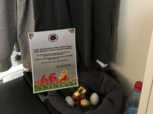 Für die Mannschaft stand indes natürlich auch am Ostersonntag eine Trainingseinheit an: Doch unser Wirtschaftsrat um den Vorsitzenden Horst Müller und Stellvertreter Markus Buchcik ließ es sich nicht nehmen, alle Spieler, Trainer und Betreuer in der Kabine mit einem süßen Ostergruß zu überraschen. „Der Osterhase überrascht euch mit einer besonderen Frühjahrsprämie“, heißt es da. „Für jeden erkämpften punkt eine leckere und goldige Überraschung. Wir sind ohne Ende stolz auf Euch!“